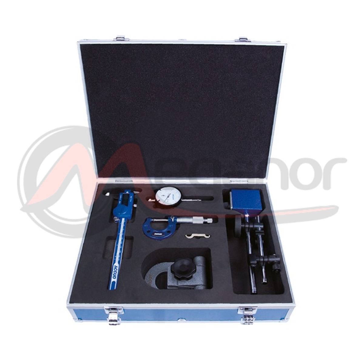 Composição:5 instrumentos de mediçãoem caixa metálica:1 paquímetro digital (0 - 150mm)1 micrómetro centesimal (0 - 25mm)1 comparador (10mm)Suporte magnético para comparadorSuporte para micrómetro