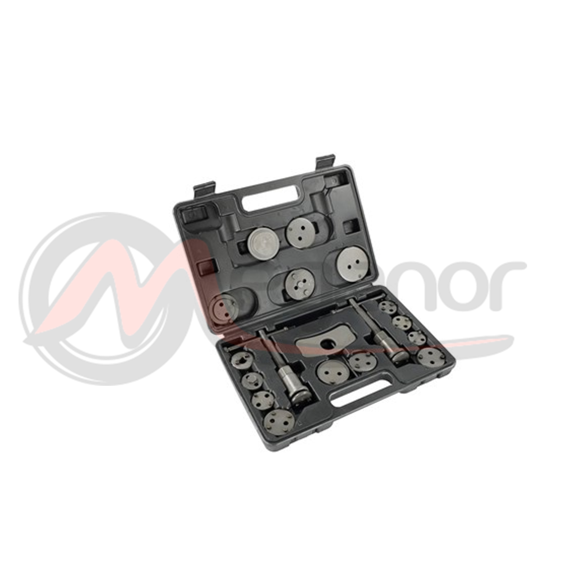 Este kit de prensa para pistão de freio com 18 peças é a solução perfeita para todos os entusiastas e profissionais do setor automotivo que buscam ferramentas confiáveis ??para reparos no sistema de freio. O conjunto é compatível com a maioria dos carros do mercado. O conjunto completo é embalado em um estojo plástico resistente a choques e fácil de transportar. O manípulo possui uma ponta magnética que mantém a placa correspondente ao pistão em questão alinhada.