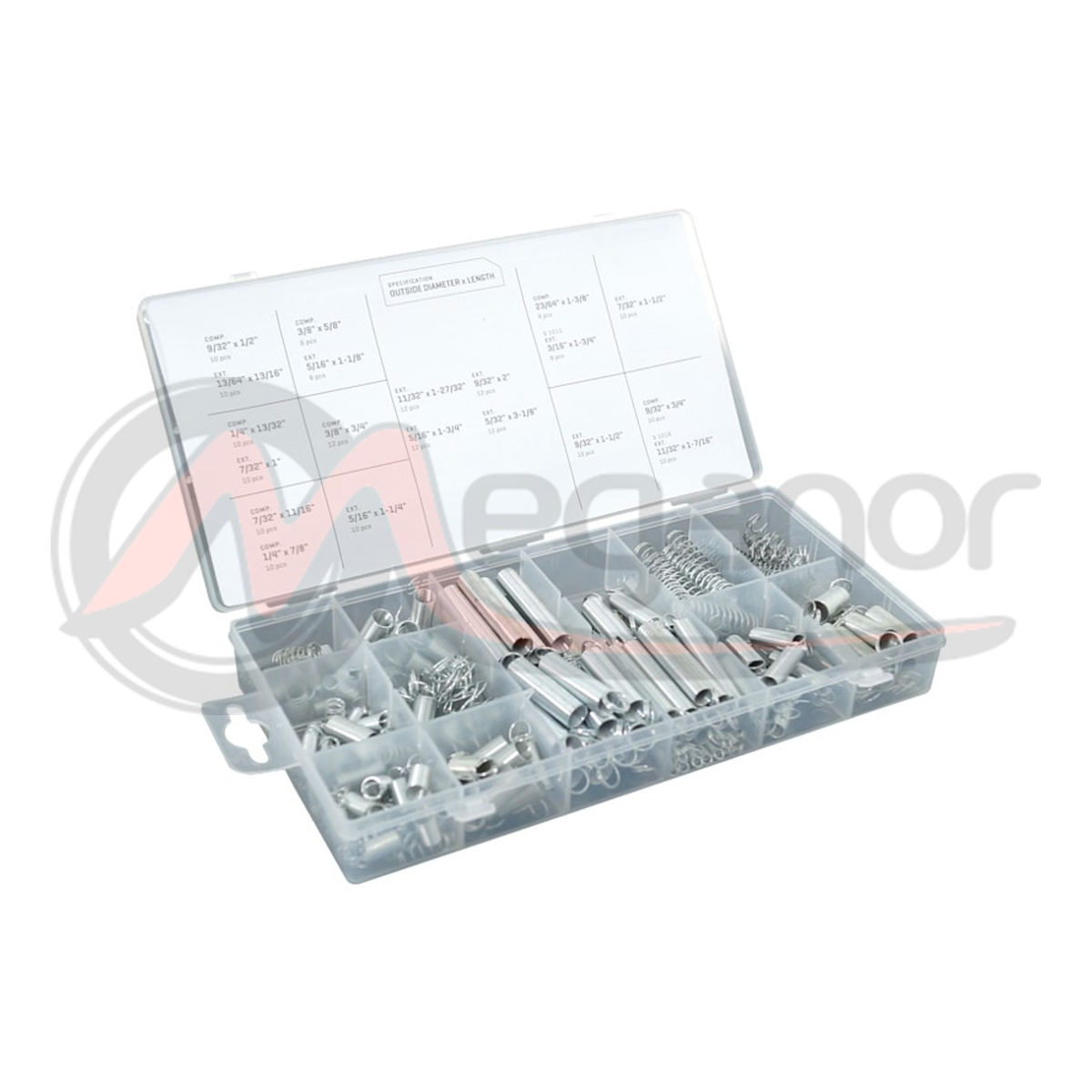 Conjunto de molas em 20 tamanhos diferentes, fabricadas em aço galvanizado. Conjunto inclui molas de extensão e molas de tensão. Molas de extensão: 13/64 \"x 13/16\" - 10 peças 7/32 \"x 1\" - 10 peças 1/4 \"x 7/8\" - 10 peças 5/16 \"x 1-1 / 8\" - 8 peças 5/16 \"x 1-1 / 4\" - 10pcs 11/32 \"x 1-27 / 32\" - 10pcs Molas de tração: 9/32 \"x 1/2\" - 10pcs 1/4 \"x 13/32\"- 10pcs 7/ 32\" x 11/16\"- 10pcs 3/8\" x 5/8\"- 6pcs 3/8\" x 3/4\"- 12pcs 23/64\" x 1- 3/8\"- 8pcs 7/32\" x 1 -1/2\"- 10pcs 9/32\" x 3/4\"- 10pcs