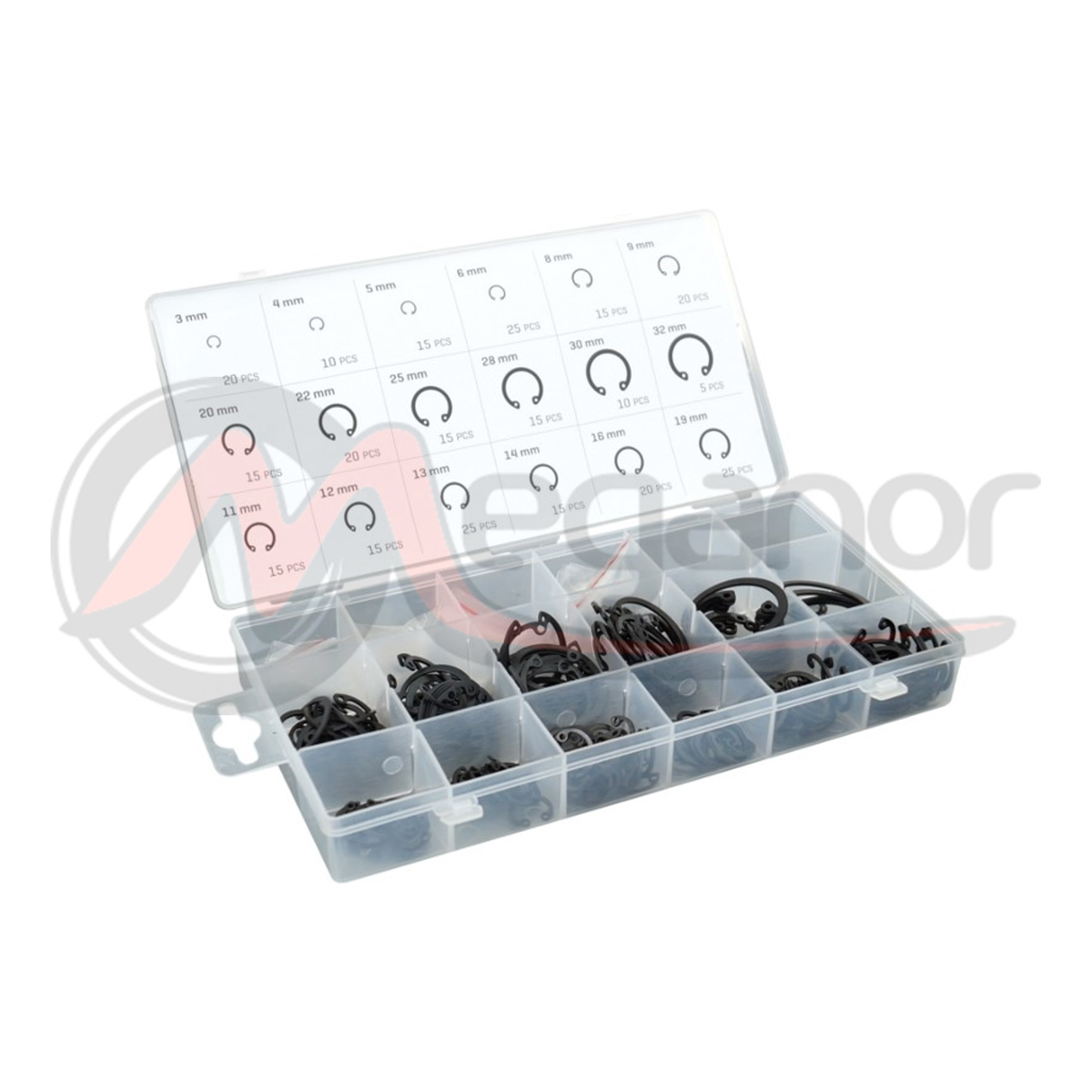 Conjunto de anéis internos. Embalado em uma caixa de plástico durável. Eles são feitos de aço durável e resistente e projetados para uso em qualquer oficina mecânica. O conjunto inclui: 3 mm x 20 unidades, 4 mm x 10 unidades, 5 mm x 15 unidades, 6 mm x 25 unidades, 8 mm x 15 unidades, 9 mm x 20 unidades, 11 mm x 15 unidades, 12 mm x 15 unidades , 13 mm x 25 unidades, 14 mm x 15 unidades, 15 mm x 20 unidades, 19 mm x 25 unidades, 20 mm x 15 unidades, 22 mm x 20 unidades, 25 mm x 15 unidades, 26 mm x 15 unidades, 28 mm x 10 unidades, 32 mm x 5 unidades.
