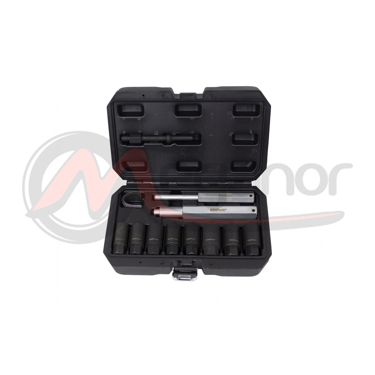 Este kit inclui uma seleção de vasos cónicos que podem ser martelados sobre pernos de roda bloqueados ou danificados para auxiliar na sua remoção