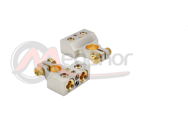 O conector possui 4 saídas de diâmetro (duas com diâmetro 0/2/4 e duas com diâmetro 8/10), o que permite a ligação de múltiplos cabos. O grampo positivo adapta-se a um poste de 17,5 mm e o grampo negativo adapta-se a um poste de 15,9 mm. São feitos de uma liga de zinco e cobre.