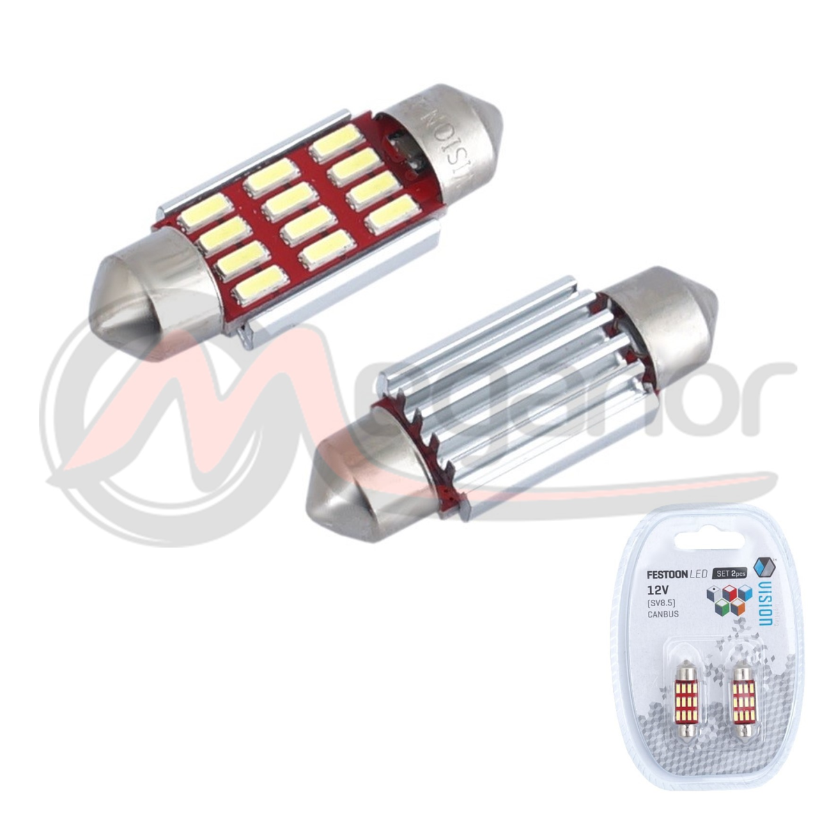 A fonte de luz é 12x 4014 SMD LED. Cor clara branca (6000K). A tensão é 12V. Consumo de energia: 2,3W. Comprimento 36 mm. A embalagem contém 2 peças