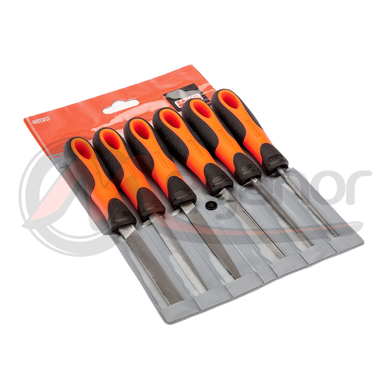 Cabo para lima desenvolvido de acordo com o processo científico ERGO|Para limagem de superfícies planas, cantos e ombros afiados, bem como para desbaste|Para limagem de furos, grandes lombos e superfícies côncavas|Índice de remoção elevado|Conjuntos de 5 limas com cabo|Embalagem de cartão com visualização exterior, contendo uma bolsa de plástico de enrolar|Contém um de cada: manual bastardo, manual 1/2 murça, quadrada bastarda, meia-cana bastarda, redonda bastarda|Tipo de picagem: 1 = Bastardo