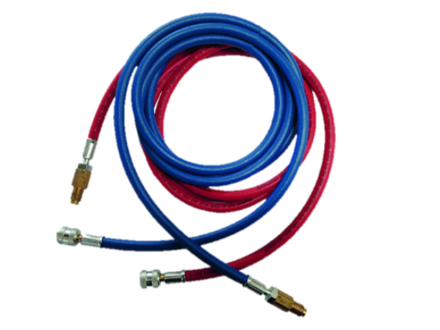 Gama de mangueiras flexíveis em 3 cores (Vermelho, Azul, Amarelo) para ligação de máquinas e equipamentos a sistemas de A/C automóvel.