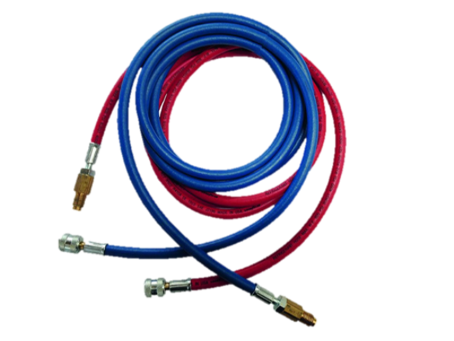 Gama de mangueiras flexíveis em 3 cores (Vermelho, Azul, Amarelo) para ligação de máquinas e equipamentos a sistemas de A/C automóvel.