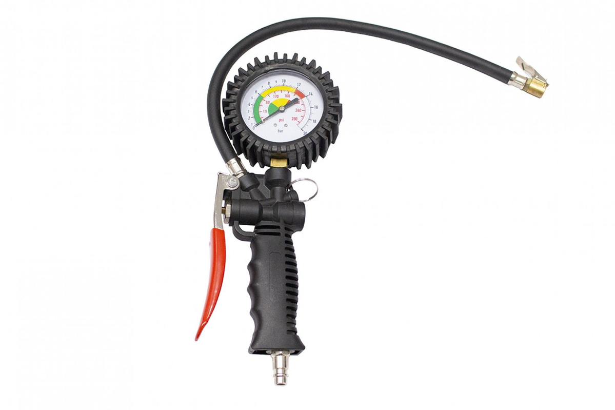 Características: Manómetro muito resistente Manómetro de pressão com 80mm diâmetro Mangueira de borracha com encaixe de ar metálico Gatilho de pressão ergonómico e de uso prático