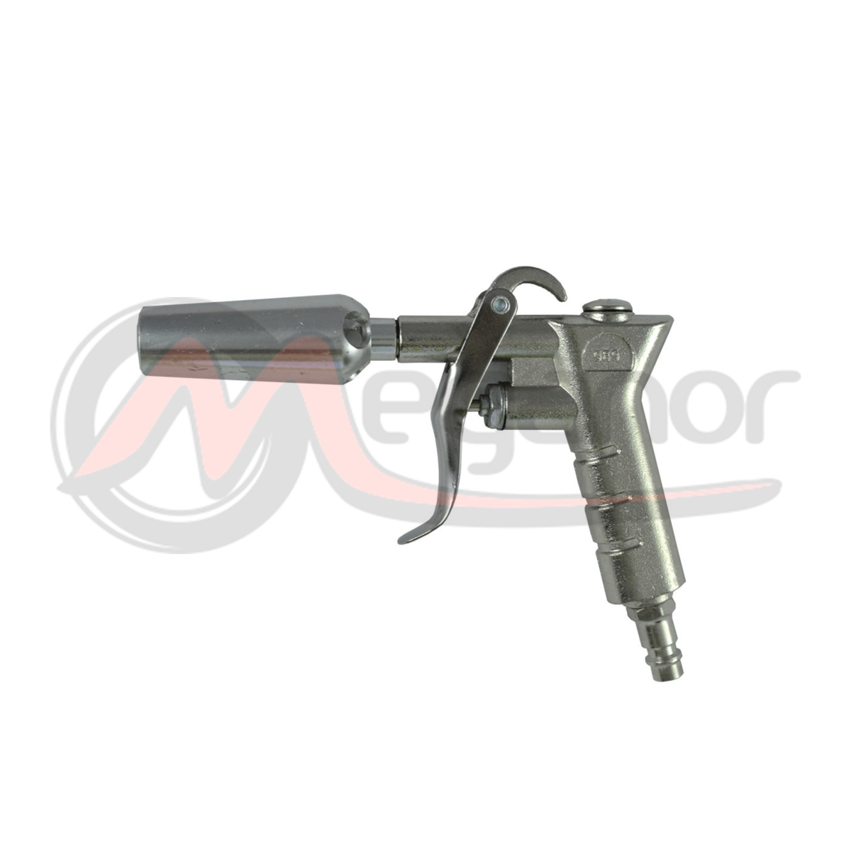 Pistola de soprado de grande caudal.Pressão máxima: 10 barEntrada de ar: 1/4\'\'Material do corpo: Liga de alumínio.Superfície: Niquelado.