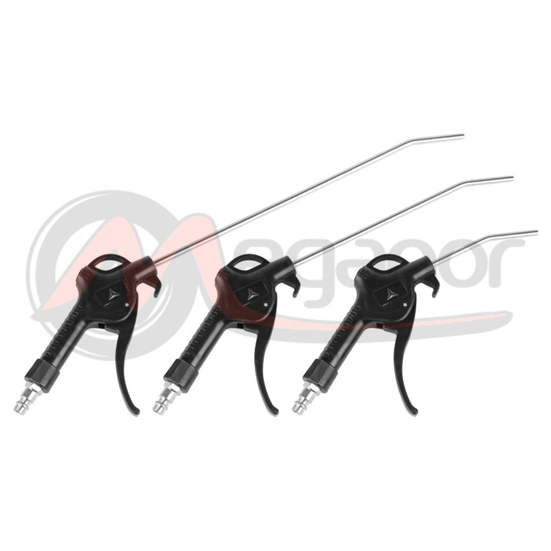 -Um conjunto de três pistolas com bicos de vários comprimentos e uma conexão de 8 mm. São utilizadas para remover diversos tipos de contaminantes com um jato de ar comprimido na cabine do veículo e em locais de difícil acesso. Pressão máxima: 15 atm.