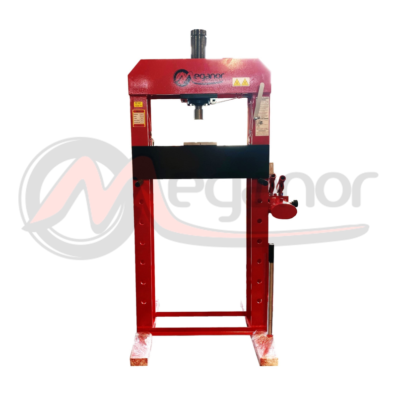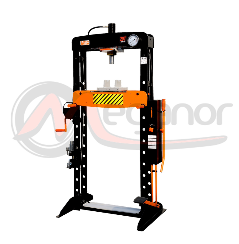 Estrutura soldada robusta com um design exclusivo com formas arredondadas|Manómetro grande com glicerina para uma leitura fácil e conveniente ao nível dos olhos|Pistão deslizante e cromado|Regras para facilitar a centragem do pistão com o item para extrair|Dois blocos em V incluídos, utilizáveis no lado em V ou plano, dependendo da necessidade|Pinos de centragem automática para a mesa|Bomba de velocidade dupla com válvula de sobrecarga de segurança incorporada|Elevação e abaixamento simples da mesa de prensa graças ao guincho com cabo giratório|Abordagem rápida graças ao pedal ou ao cabo|Pedal com base de borracha antideslizante|Conjunto de punções de pressão com oito pinos e uma placa de punção incluídos|Todos os cabos isolados|Bandeja de ferramentas no fundo|Pés robustos e estáveis|Certificado de acordo com 2006/42/CE