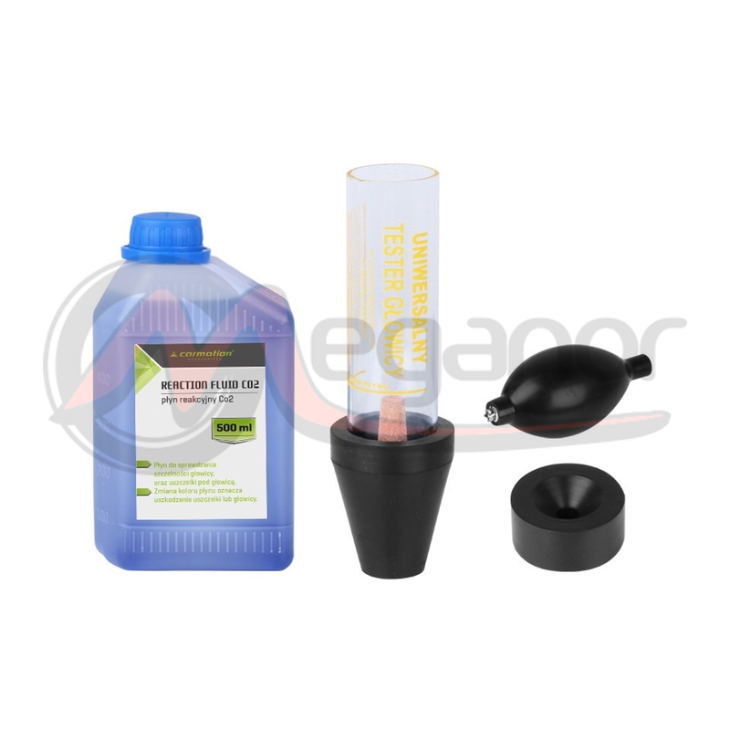 -Se você suspeitar de danos na junta do cabeçote ou no próprio cabeçote, você mesmo pode realizar um teste de verificação. O testador é adequado para motores de combustão interna refrigerados a líquido (gasolina, diesel, GLP). No caso de um cabeçote danificado ou junta do cabeçote, parte dos gases de escape contendo, entre outros, CO2 vai para o sistema de arrefecimento. O princípio de operação do dispositivo é baseado na medição da concentração de CO2 - no caso de aumento da concentração, o fluido de reação reage com o CO2 e muda de cor. Pode ser utilizado em: motocicletas, escavadeiras, máquinas agrícolas, agregados.