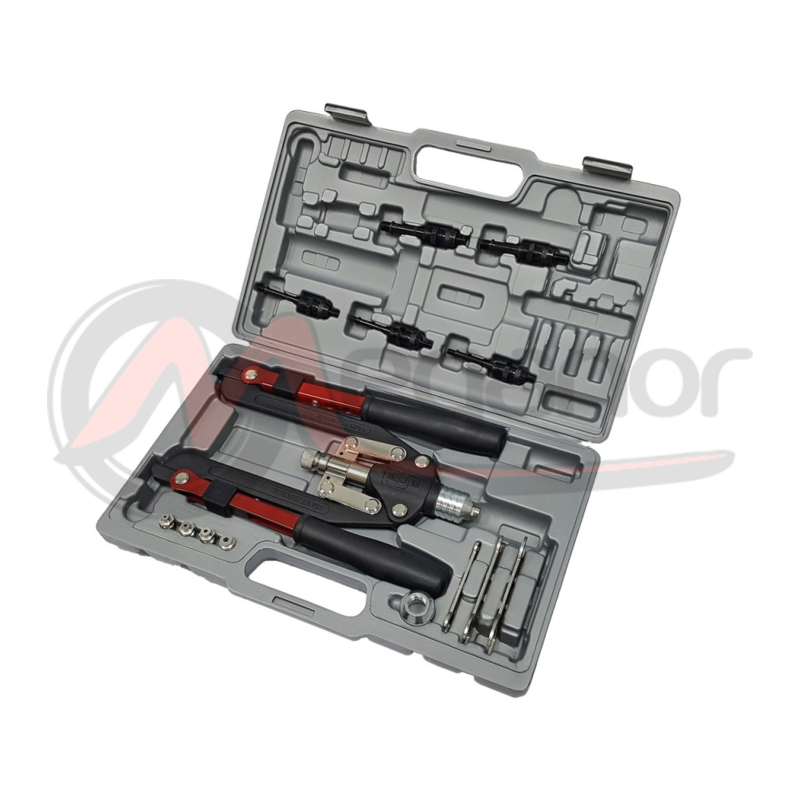 Uma ferramenta de alavanca (alicate de braços) muito robusta, concebida para a utilização profissional, tanto em interiores como em exteriores. É a ferramenta apropriada para aplicações onde sejam empregues rebites de 4,8/5,0 em qualquer material, assim como 6,0 mm em alumínio, estruturais de 4,8 mm ou S-trevo de 5,2 e 6,4 mm.