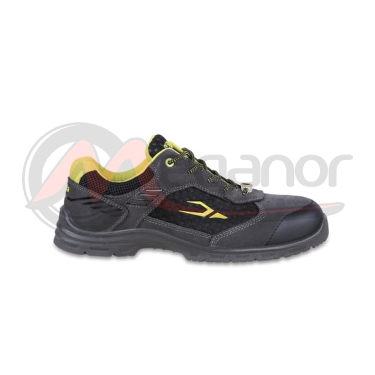 Sapatos de camurça e malha S3. Hidro-replente, biqueira compósita, forro tridimensional, têxtil entressola anti-perfuração, leve, flexível e antimagnética. Livre de metal. Sola E.V.A.(etileno, vinil e acetato) + borracha, HRO(resistente até 300ºC), resistente hidrocarbonetos, antiestático, amortecedor e SRC.