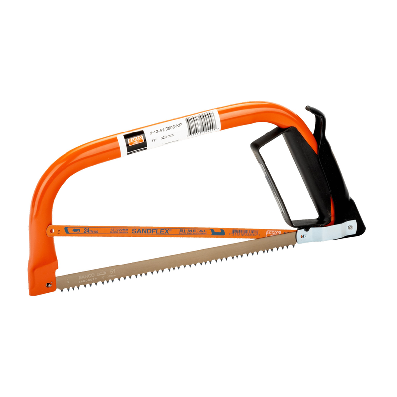 Mini-serrote de arco, para caixa de ferramentas. Indicado para canalizadores, electricistas ou outras actividades. Fácil de guardar, no carro, no barco ou na sua caixa de ferramentas. Comprimento de 12\" (300 mm), equipado com uma folha modelo 51, para corte de madeira e uma modelo 3906 SANDFLEX® Bi-metal, para corte de metais. Sistema de protecção da lâmina e da mão.