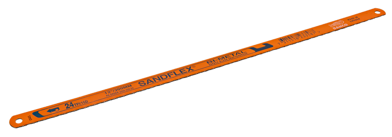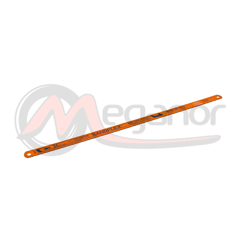 Uma folha revolucionária para serrote de metais, praticamente inquebrável, dentes rectificados, para todos os tipos de cortes em metal. Corpo em aço flexível e dentes em aço rápido, sendo garantida a sua longa vida. A nova SANDFLEX®, combina a extrema resistência e capacidade de corte com um alto grau de flexibilidade e uma maior superioridade em relação às folhas de serrote manual em aço rápido convencional, e/ou flexiveis. . Embalagens : . -100 : 10 pacotes de 10 folhas cada, em caixa plástica preta, com tampa transparente.. -100-RET : 100 folhas individuais, marcadas com código de barras, em embalagem única.. -10P : 10 folhas em embalagem especial com suporte.. -5P : 5 folhas em embalagem especial, com suporte.. -3P : 3 folhas, sendo uma de cada medida (18, 24, 32 dentes), em bolsa plástica, caixa com 10 bolsas.. -2P : 2 folhas em blister. Caixa de 10 blisters.