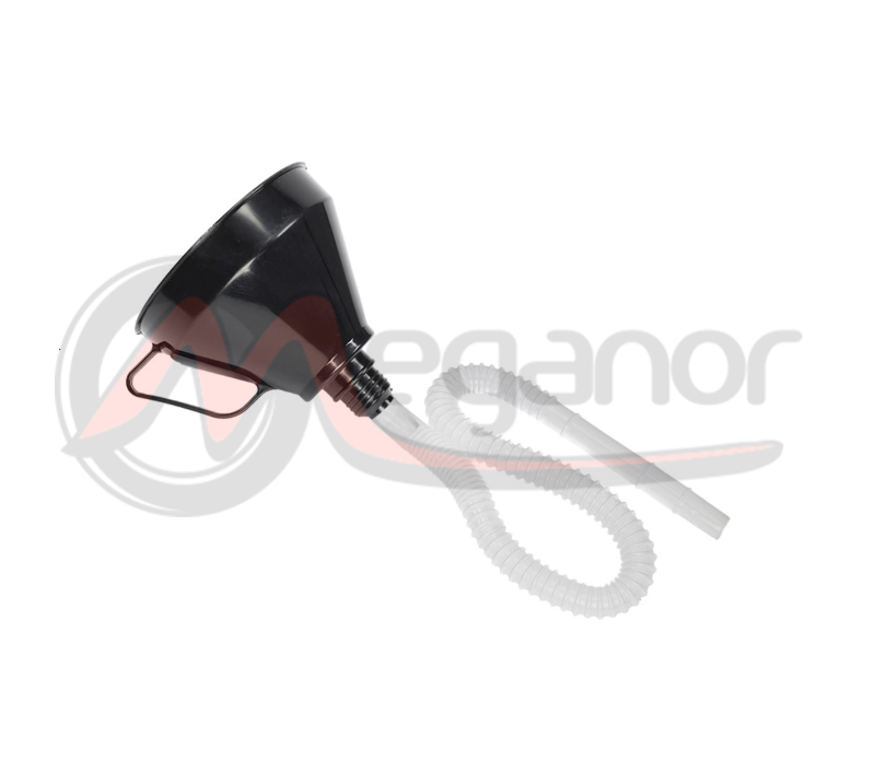 Um funil estreito, pequeno e conveniente com uma mangueira flexível é perfeito para despejar óleo, água, líquido do radiador e líquido de lavagem do pára-brisas.