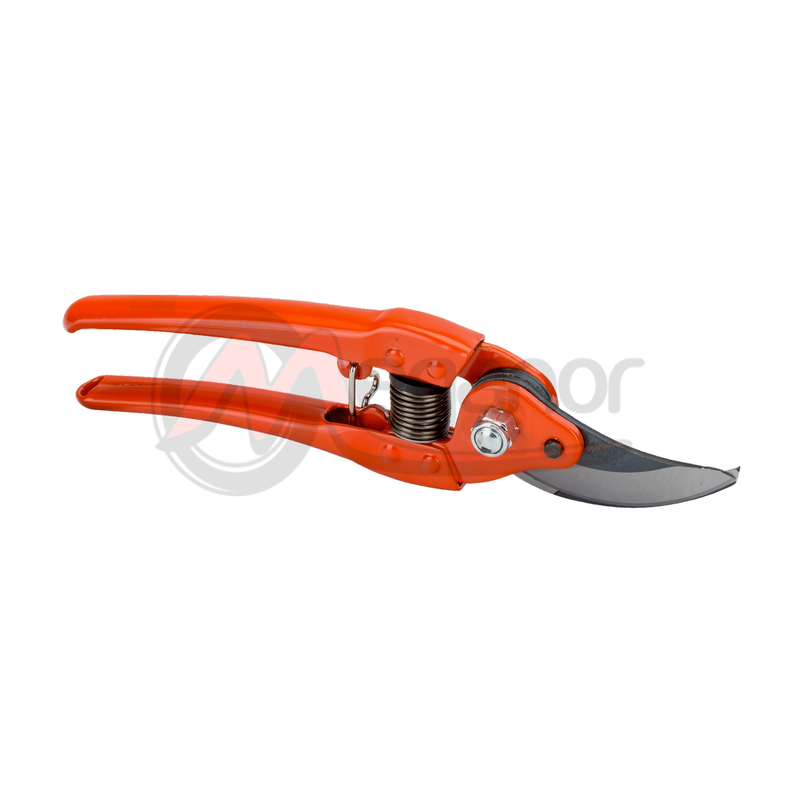 Tesoura profissional de desenho tradicional, para a poda de vinhas e pomares. Punhos em aço estampado. Sistema de fecho com peça de metal, accionado com uma só mão.