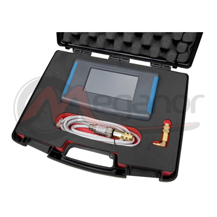 Este é o kit básico, que inclui o testador multifuncional, o sensor de 80 bar e o conector de cotovelo de 90°.