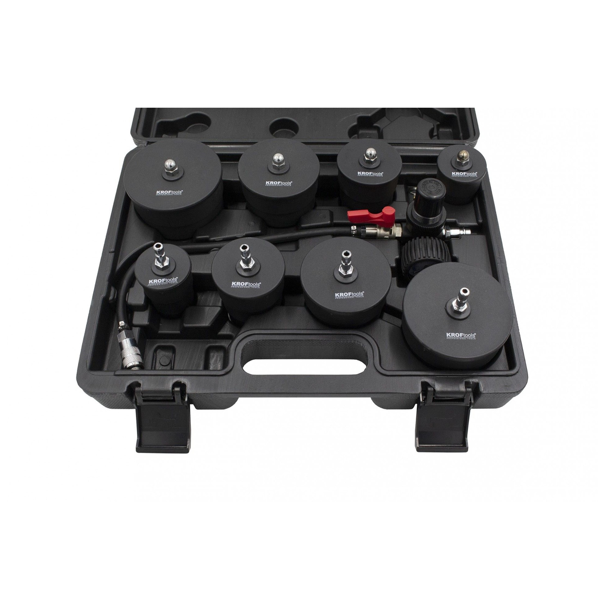 Jogo fornecido com quatro pares de adaptadores escalonados para caber na maioria dos tamanhos de mangueira