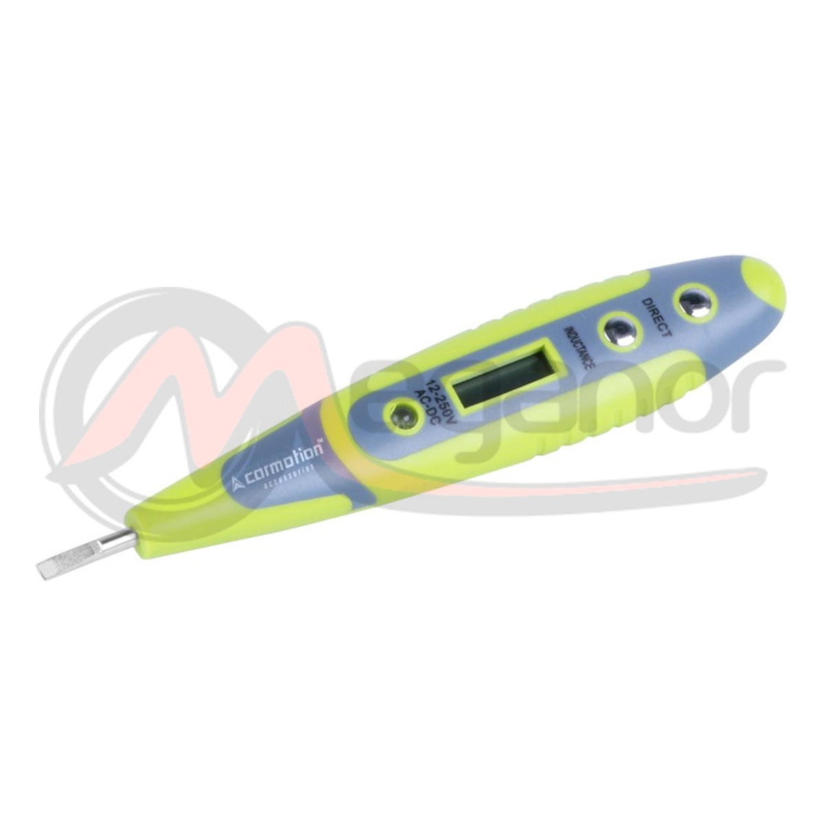 Características: Tela LCD que exibe os resultados da medição nas faixas de até 12, 24, 36, 55, 110 e 220 V sinalização LED adicional Ponta plana de 2,9 mm de largura permite acesso preciso a pequenos elementos fonte de alimentação: 3 x LR41 (incluída )Aplicação: